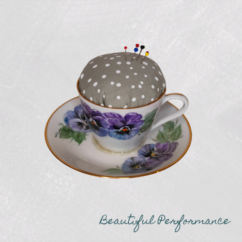 Ainutlaatuisia ja söpöjä nuppineulatyynyjä kierrätetyissä posliinikupeissa.