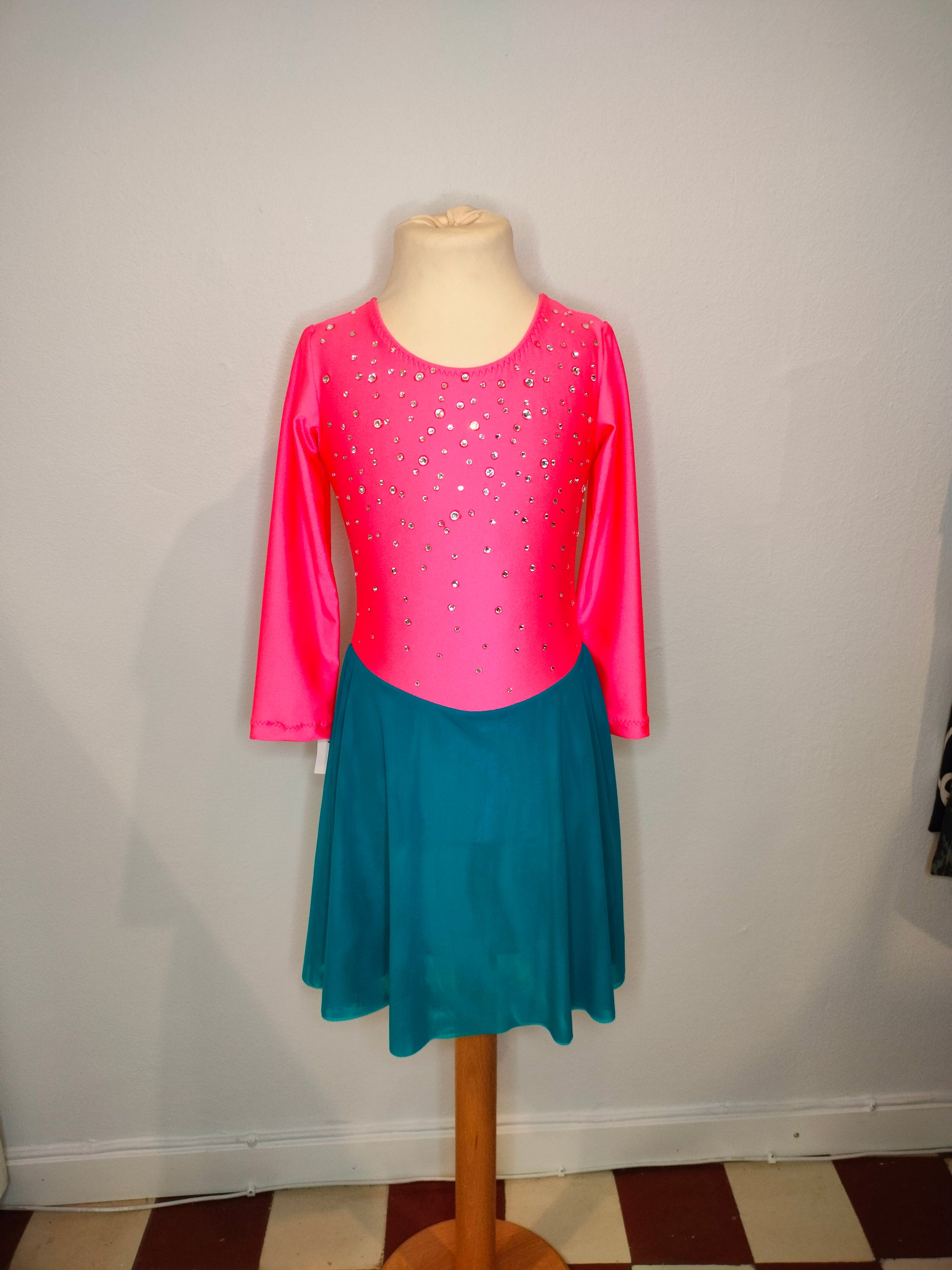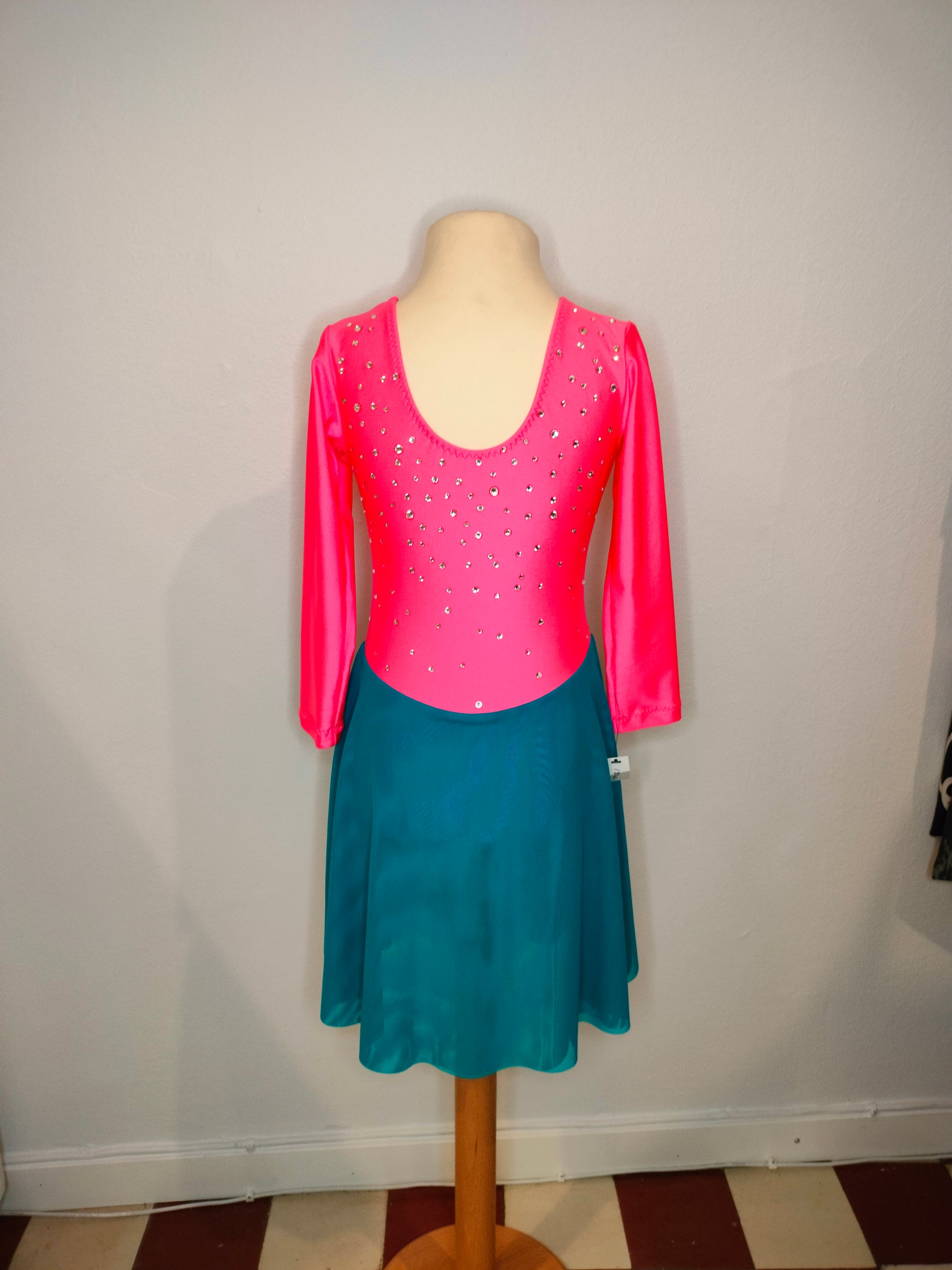 Oranssin pikki puku petrolin värisellä helmalla. Helman pituus sopii esimerkiksi jäätanssiin ja on muokattavissa myös muihin lajeihin sopivaksi.