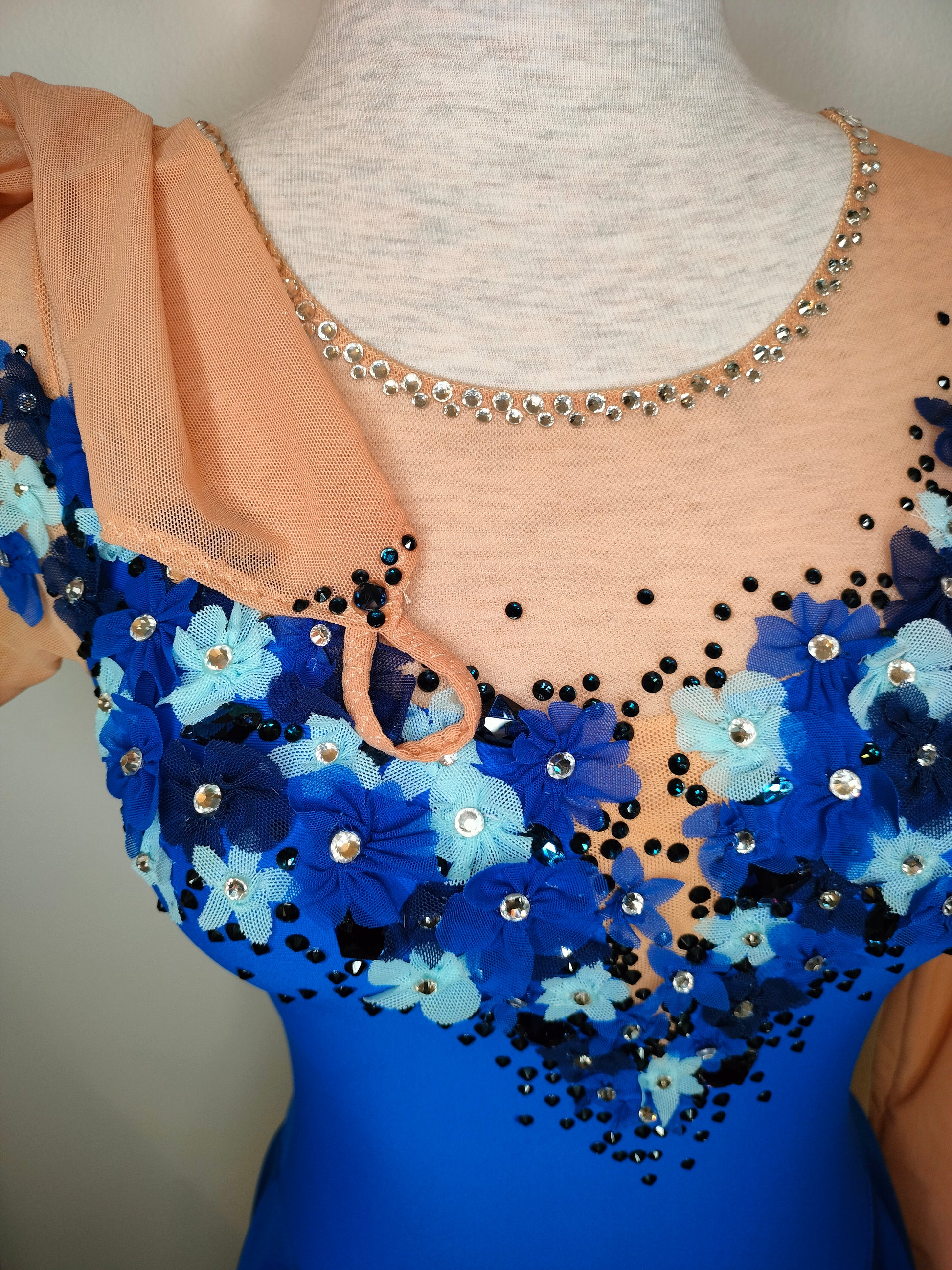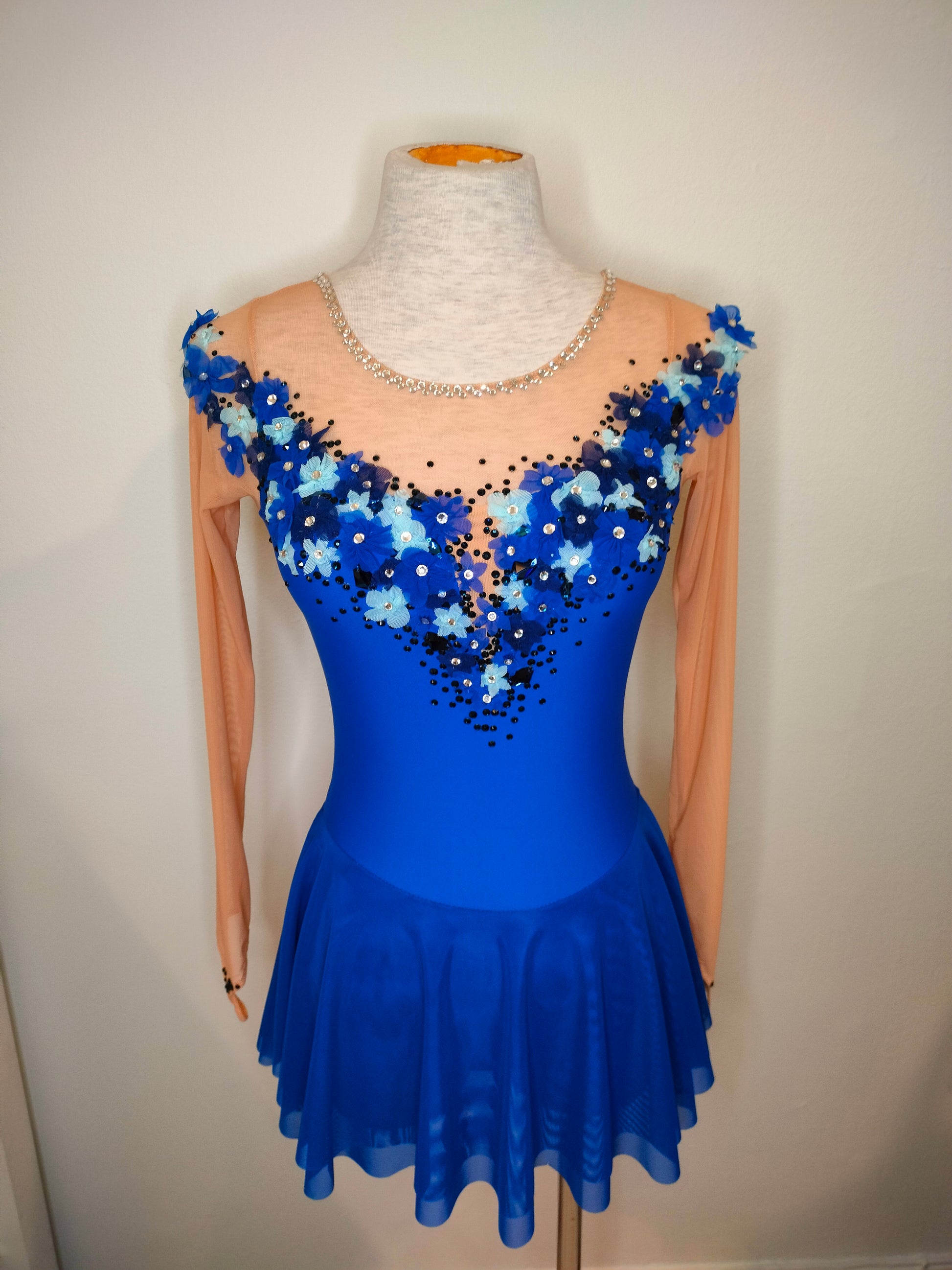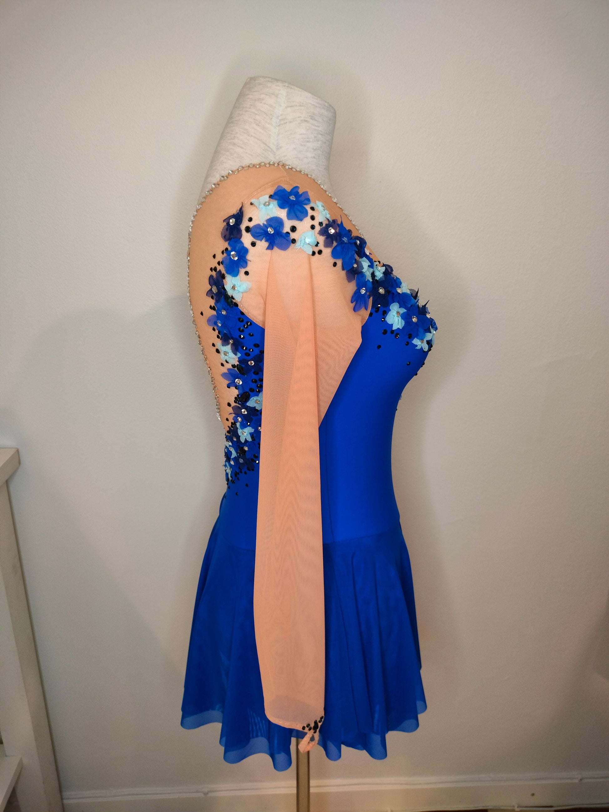 Tämä käsintehty luistelupuku on uniikki kappale, suunniteltu korostamaan luistelijan liikettä, musiikin tulkintaa ja esiintymistä jäällä. Puku sopii täydellisesti kilpailuihin ja näytöksiin.